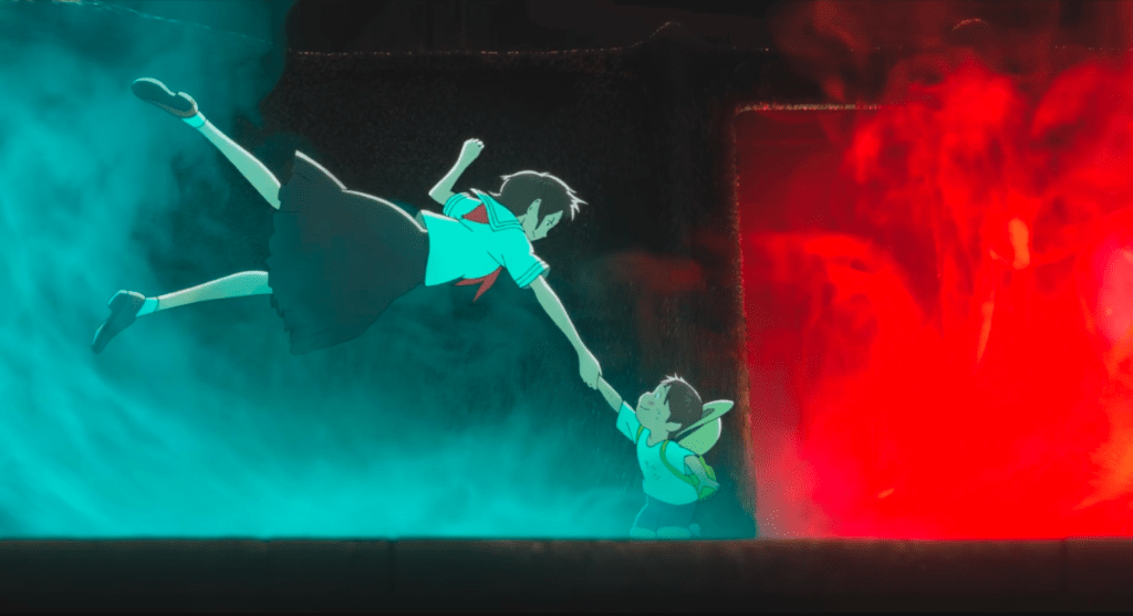 Mamoru Hosoda shows us this unbroken chain and what it means to our relationship with the past and future in a scene at the end of the film. The humorous and light tone of the film is interrupted briefly in order to summarize the themes that Hosoda has set up throughout. The film shows the audience the destruction of a Japanese battleship and the death of the sailors onboard. Kun and the middle school aged Mirai fly past as their great-grandfather lays floating among the wreckage, among the countless dead, seemingly ready to give up. But he catches himself from sinking and turns and starts swimming at full speed. Mirai points out that this moment, this single moment where a man refused to die when other men who were surrendering to the water, was the start of his entire family. If this one person didn’t make that single decision then his children, his grandchildren, and finally his great-grandchildren; who are now witnessing this scene, would not exist.